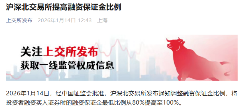 1月14日,经中国证监会批准,沪深北交易所发布通知调整融资保证金比例,将投资者融资买入证券时的融资保证金最低比例从80%提高至100%。需要说明的是,此次调整仅限于新开融资合约,调整实施前已存续的融资合约及其展期仍按照调整前的相关规定执行。