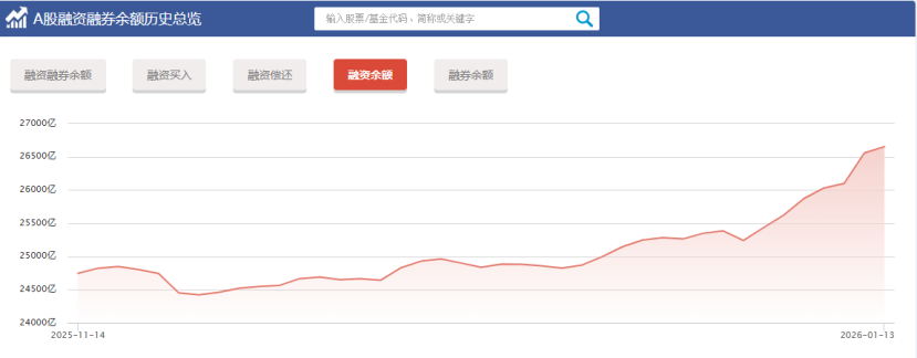 截至1月13日,2026年以来A股融资净买入金额已超1400亿元,而2025年全年A股融资净买入为6700亿,即开年不到两周融资净买入额已超去年20%。